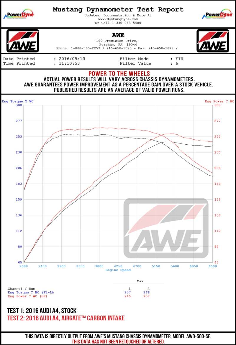 Break the mold with AirGate*. The AirGate* Carbon Intake for the B9 A4/A5 The AirGate* Carbon Intake allows options for those seeking more volume from their intake when under boost. Want to hear more turbo inductions sounds from within the cabin? Go lidless. Prefer to keep it a bit more stealthy? Simply bolt the AirGate* lid in place with a few turns of two easily-accessible hex screws. Constructed of genuine 2x2 carbon fiber with a UV-stabilized resin and clear coat, the AirGate* Carbon Intake mounts securely to the stock location and integrates with the factory ducting perfectly via the AirGate*s floating airbox inlet. The S-FLO Filter The included AWE S-FLO Filter is designed specifically for this air box to be easily serviceable and to maximize airflow. This increase in airflow unlocked maximum gains of 12 hp and 9 lb-ft of torque at the wheels. The combination of carbon fiber airbox and included S-FLO Filter makes for a more aggressive intake note, with an intoxicating turbo spool sound. Please Note: AWE AirGate Intakes are for Racing Use Only.