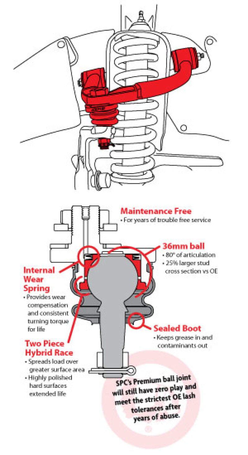 Improve droop travel, drivability and tire wear as well as adjusting tire position in your wheel well with SPC's adjustable front upper control arms for Toyota Land Cruisers (200 Series). Featuring our long life maintainable ball joint and SpecRide bushings, this arm is designed to correct alignment angles while maintaining factory ride quality. SPC's integrated tubular and cast steel design provides the strength and durability needed for most demanding environments. These remove and replace arms are available in pairs for lifted and off-road applications. Get more droop travel: SPC's arm has improved clearance to get around the spring bucket when the arm droops, eliminating arm to frame contact on lifted trucks. The maintainable ball joint has an oversized ball and allows more than 80deg of articulation to ensure it never binds. SpecRide bushings have free pivot to eliminate any chance of bushing failure seen on many high travel suspensions. Get your drivability back: When you lift your truck you affect caster and camber. SPC's arms have +1deg of caster built into them. Using its patented ball joint design the arm will get you +0deg to +4deg of caster and +-2deg of camber. Get your tire where you want it in the wheel well: Use adjustment in the control arm and on the OE lower cams to maximize alignment angles and move oversized tires forward in the wheel well to minimize or avoid fender trimming. Do you need heavy duty rear lower arms? Check out SPC p/n 25965, which are move than 2x stronger than the OE arms. * On the adjustable ball joint SPC uses hex chromate free finish and offers a 700hr salt spray test for the best corrosion protection available. California Residents WARNING