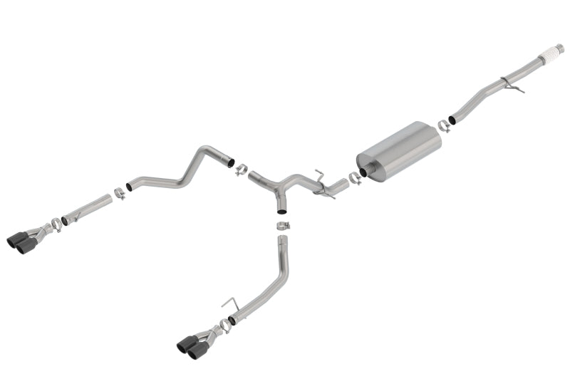 This 3" diameter into dual 2.75" Borla(r) Cat-Back(tm) system features the mellow Touring sound level with no drone inside the vehicle, and dual 3.5" round black chrome on T-304 stainless steel tips on each tail pipe. Bright chrome on T-304 stainless steel tips and carbon fiber tips are also available. Installation REQUIRES removal of the Factory Valance Tips. Using Borla(r) Stainless Steel Polish p# 21461 is NOT recommended with these black chrome tips. We suggest cleaning the tips with hot water and a microfiber cloth. Carbon fiber tips with bright centers are also available. Borla(r) Cat-Back(tm) and Axle-Back exhaust systems feature patented straight-through and multi-core technology designed to unleash hidden horsepower. Increased exhaust velocity adds power, driving excitement, fuel economy, and the distinctive Borla(r) Sound of Power respected by motoring enthusiasts everywhere. Each system is built from premium T-304 stainless steel, superior to T-400 series knockoffs (such as 409), to give you the absolute best in performance and durability. Ultra-smooth mandrel bends ensure maximum flow & power, and precision computer numerical control (CNC) manufacturing ensures an accurate fit. Give your Silverado or Sierra the power and sound it deserves, bolt on a Borla(r) . Best of all, Borla(r) stands behind every system with a Million-Mile Warranty. Just what you'd expect from the world's most experienced (and most winning) exhaust brand.