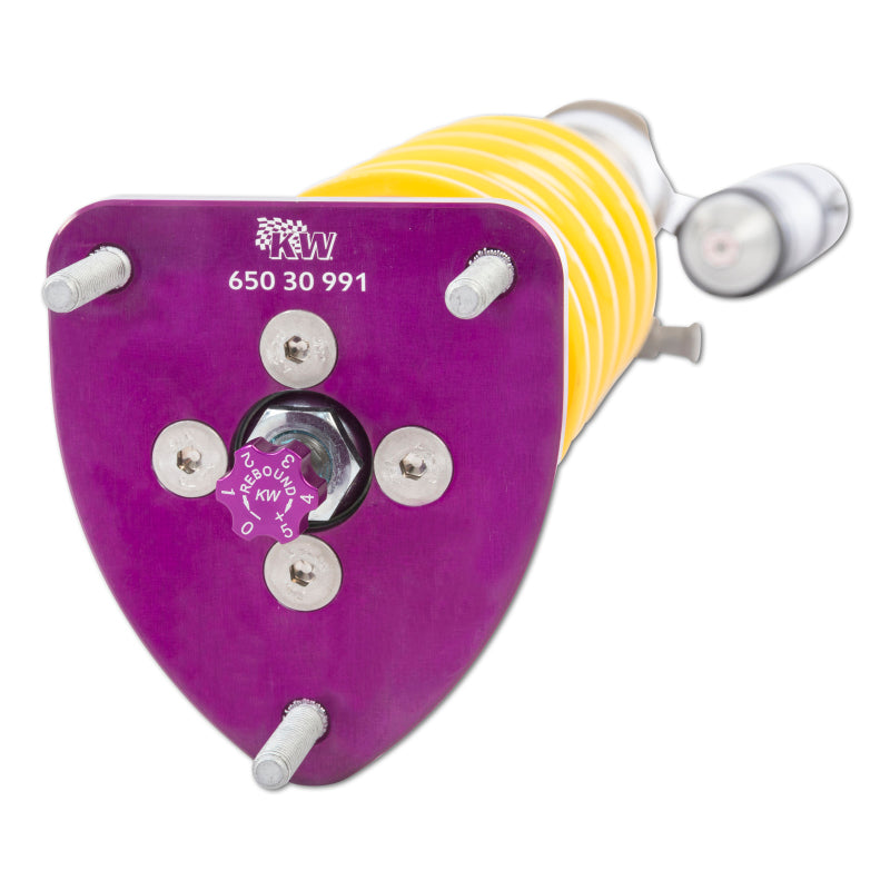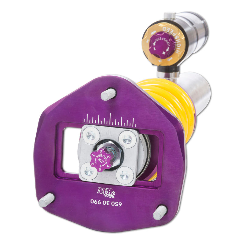 Using the Nordschleife as it's testing grounds and the 7-post rig, KW developed it's V4 Clubsport coilover kit. Wheel loads, vehicle weight and chassis reinforcements (increased body stiffness) can all be taken into consideration with Adjustment -capabilities of the V4 Clubsport. The KW Clubsport coilovers combine KW's high-end racing technology -with maintenance-free KW OEM quality components. Designed to provide you the ideal product to utilize the full potential of your sports car during autocross, track days, high performance drivers education (HPDE) courses, club racing, and is tested rigorously on race tracks such as the Nurburgring Nordschleife. Race teams rely on KW's racing expertise and experience for their vehicle setup. This same championship winning pedigree is mirrored in the development of each one of the KW Clubsport coilover systems. Similar to the KW Competition suspension used in international motorsports, the KW V4 Clubsport coilover kit allows fine tuning of the compression damping separately in the low-speed and high-speed range. The click adjustments of the TVCLH-A valve technology -ake for easy Adjustment -directly on the reservoir. You can modify the low-speed compression damping with 6 precise clicks with the purple low speed Adjustment -ial and directly beneath it the golden Adjustment -heel provides an additional 14 precise clicks of high speed compression adjustment. In addition, the TVR-A technology -provides 16 clicks to noticeably adjust the rebound damping independently of the compression damping. If you would like to adjust the KW V4 Clubsport coilover kit it can easily be adjusted for more comfort or to an alternative setup for a new race track. The KW V4 Clubsport benefits from the same motorsports technology -hat has proven its endurance with multiple overall wins at the ADAC Zurich 24h Nurburgring race.